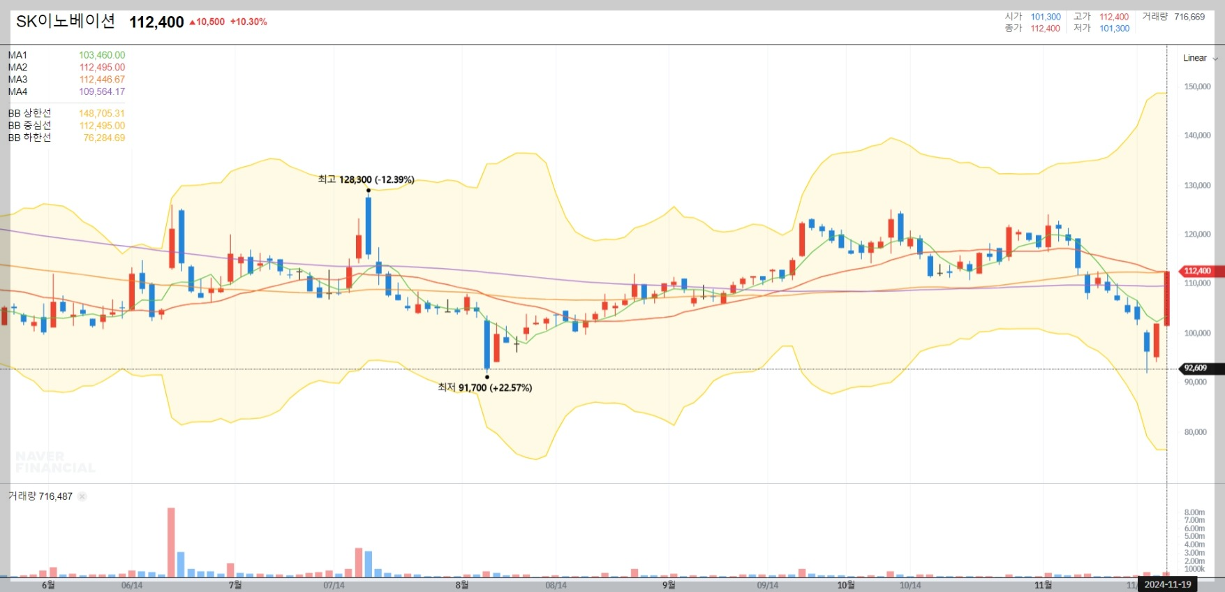 2024년 11월 19일 기준으로 SK이노베이션의 현재 주가는 112,400원입니다. 이는 전일 대비 10.30% 상승한 수치로, 단기적으로 큰 변동성을 보이고 있습니다. 최근 몇 달간의 가격 변동을 보면 최고가는 128,300원(+12.39%)였으며, 최저가는 91,700원(+22.57%)으로 기록되었습니다.