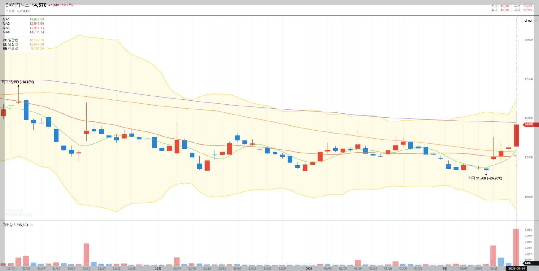 현재 SK이터닉스의 주가는 14,570원으로 전일 대비 10.97% 상승했습니다. 최근 실적 호조와 신재생에너지 프로젝트 성과로 인해 강세를 보이고 있습니다.