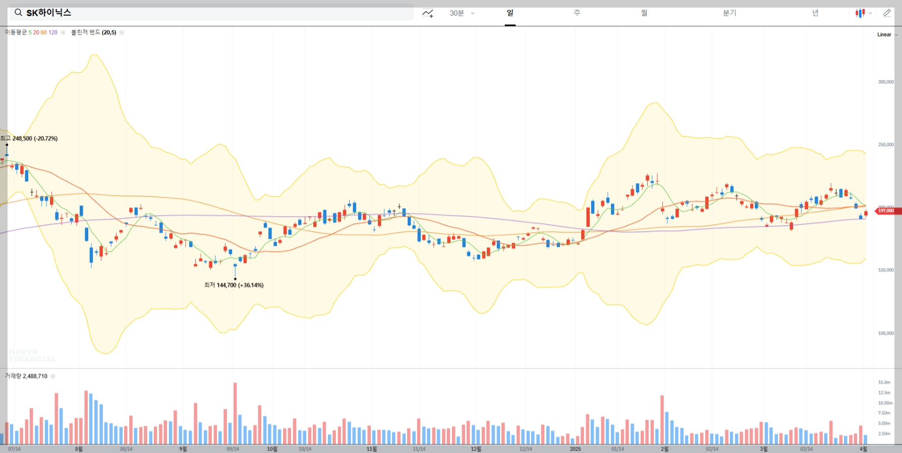 • 매매 전략: 중간밴드(20일 이동평균선) 조정 시 매수 기회 활용