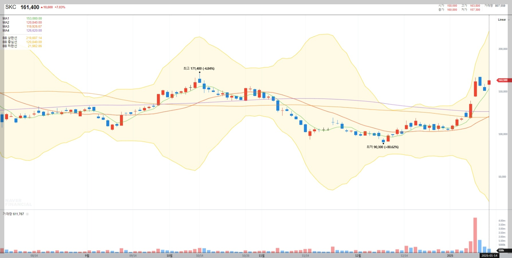 2025년 1월 14일 기준, SKC의 주가는 161,400원으로 최근 상승세를 이어가고 있습니다. CES 효과와 기술적 반등이 주요 요인으로 작용하고 있습니다.